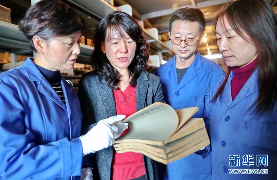 在河北省秦皇岛市图书馆,苏文珠(左二)与秦皇岛市图书馆工作人员交流古籍保护工作心得(11月23日摄)。