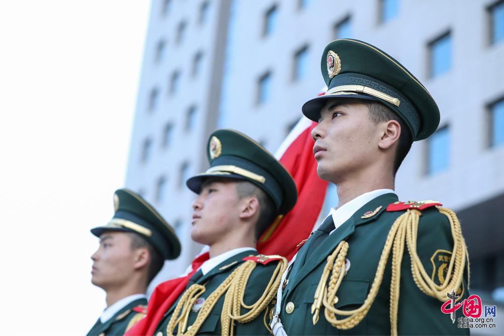 武警河南省总队郑州市支队一大队一中队举行升旗仪式。