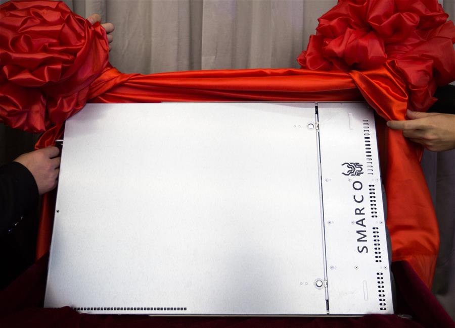 12月6日,在北京智能计算产业研究院举行的发布会现场,工作人员在整理即将亮相的高通量人工智能一体机。