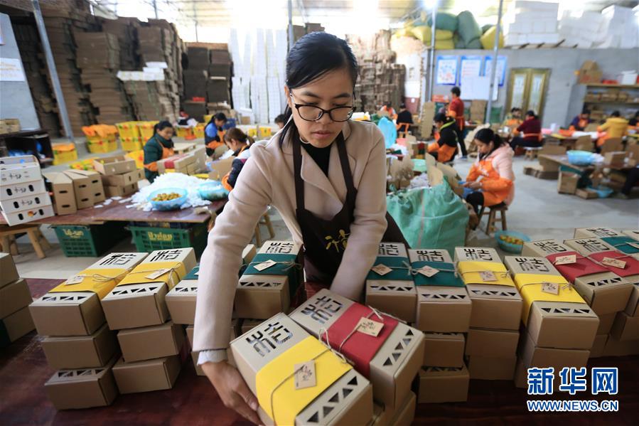 12月6日,赖园园在果品采后处理厂整理金桔礼盒的包装。新华社记者 李绚丽 摄