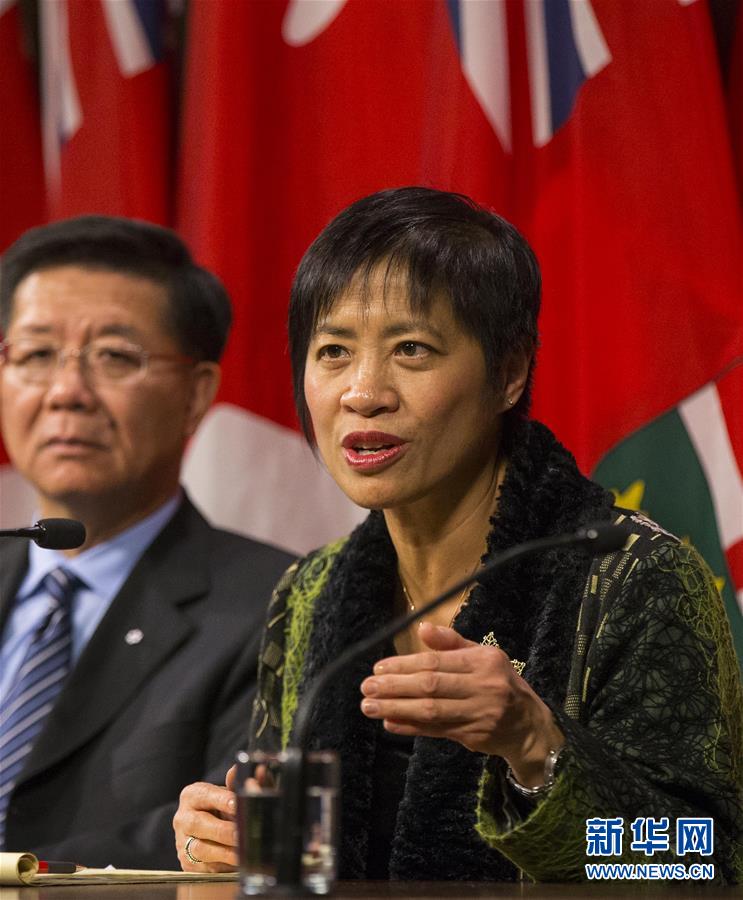 12月5日,在位于加拿大多伦多的安大略省议会,华裔省议员黄素梅(右)在新闻发布会上发言。
