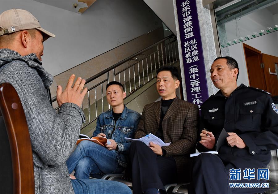 12月6日,福州市长乐区公安局禁毒大队民警(右一)和福建省榕城司法强制隔离戒毒所工作人员与社区戒毒康复人员(左一)面对面交流,了解后者的康复以及生活工作情况。近年来,福建省福州市长乐区禁毒大队在严厉打击毒品犯罪的同时,采取强制隔离戒毒与社区戒毒康复相结合的方法,对吸毒人员进行全程跟踪,深入社区与社区戒毒康复人员面对面帮扶教育,及时掌握他们的康复生活情况,帮助瘾君子从心理上戒断毒瘾,重获新生。新华社记者张国俊 摄