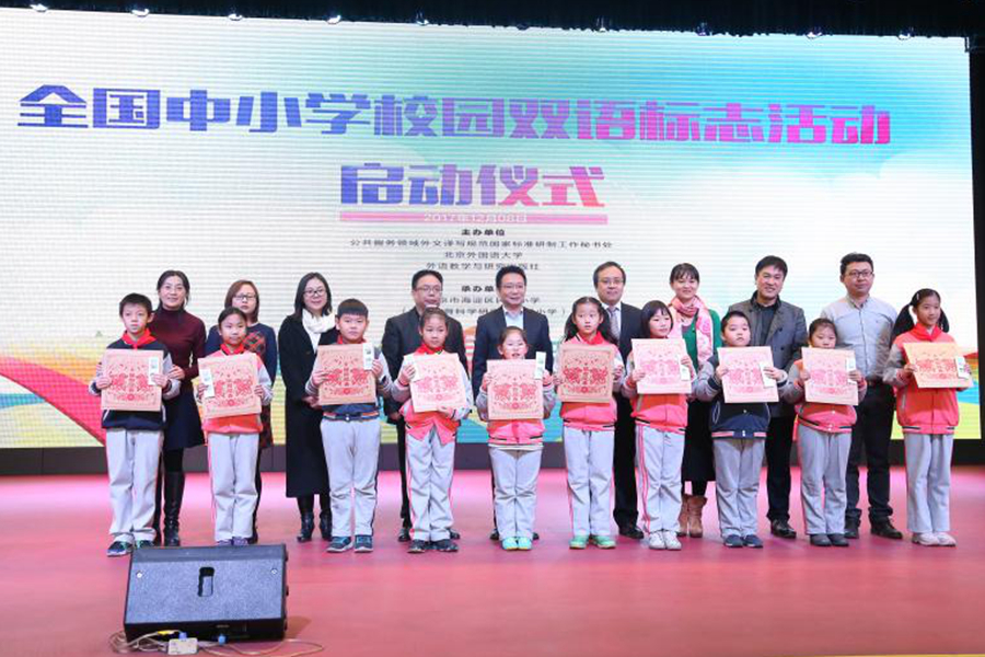 全国中小学双语标志活动启动仪式由公共服务领域外文译写规范国家标准研制工作秘书处、北京外国语大学、外研社联合主办,北京市海淀区民族小学承办。双语标志活动参照《指南》提供的规范,结合校园的文化气质与整体规划,通过学生译写、学校收集、专家把关的模式,让校园双语标志更加准确和地道,在凸显校园良好人文氛围的同时让学生在特定的双语环境中学习和欣赏外语。