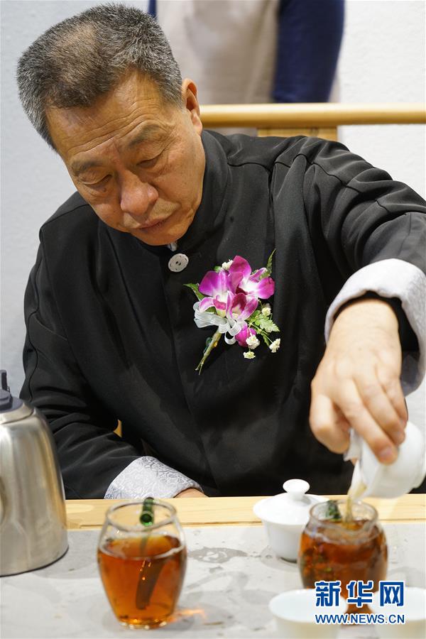 12月8日,非物质文化遗产武夷岩茶(大红袍)制作技艺传承人王顺明在活动现场为来访者演示“茶道”。
