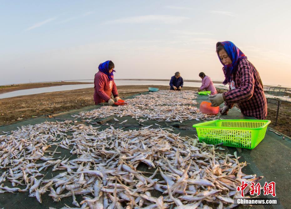 12月8日,在江西鄱阳湖都昌印山附近湖滩,渔民在晾晒凤尾鱼干。连日来,江西鄱阳湖畔鱼干飘香。渔民将捕获凤尾鱼晾晒,加工成鱼干供应各地市场。今年以来,由于鄱阳湖丰水期延长,渔民迎来丰收年。傅建斌 摄