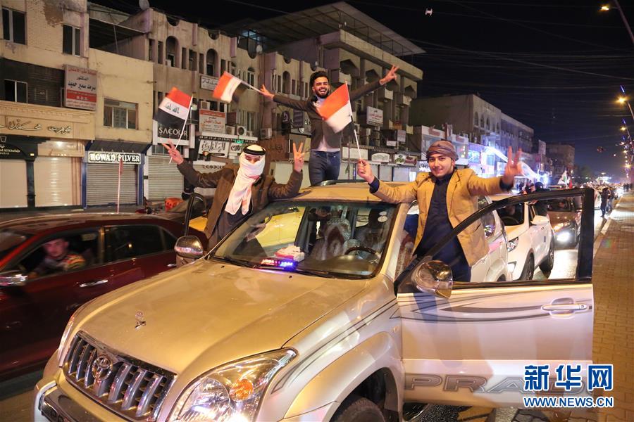 12月9日,伊拉克民众在巴格达街头庆祝胜利。 新华社发(哈利勒·达伍德摄)