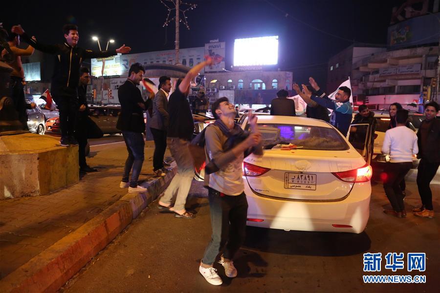 12月9日,伊拉克民众在巴格达街头庆祝胜利。 新华社发(哈利勒·达伍德摄)
