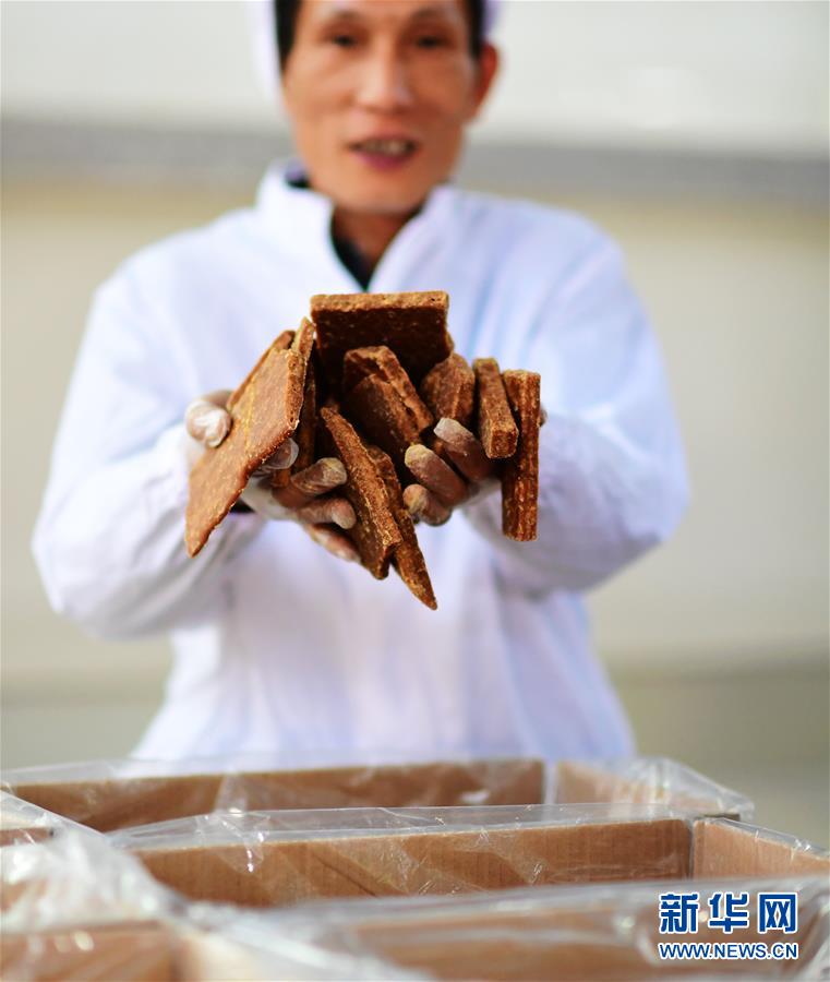 12月10日,在福安市溪潭镇洪口村的红糖作坊里,作坊负责人林晋展示准备装箱的手工红糖成品。