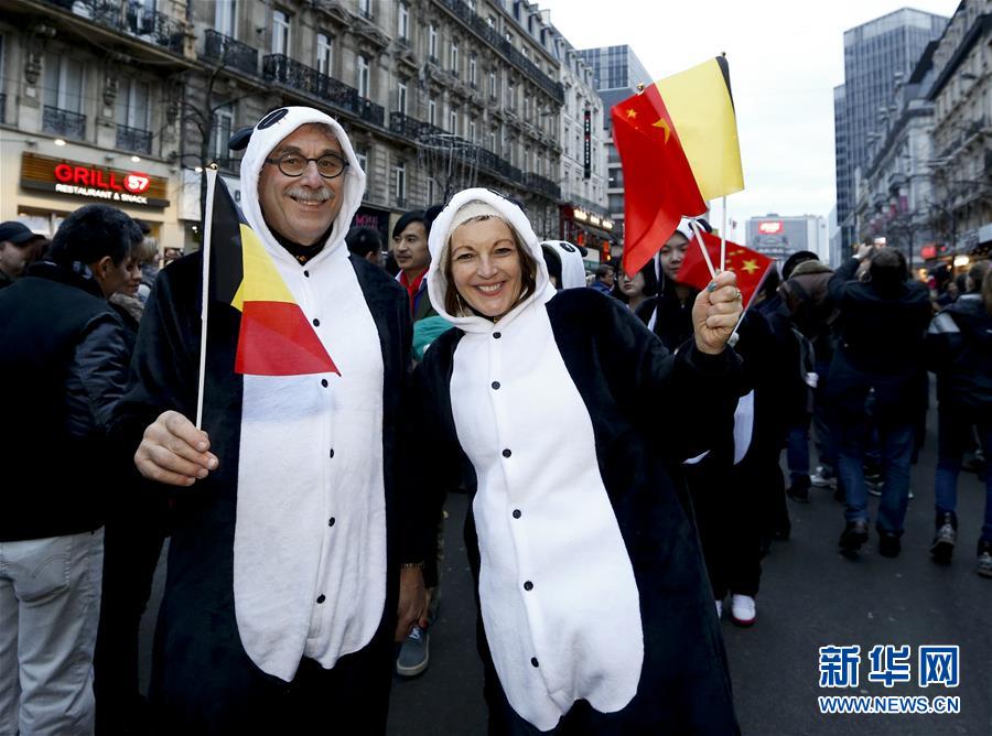 这是2017年1月28日,在比利时布鲁塞尔,一对夫妇装扮成熊猫参加春节巡游。