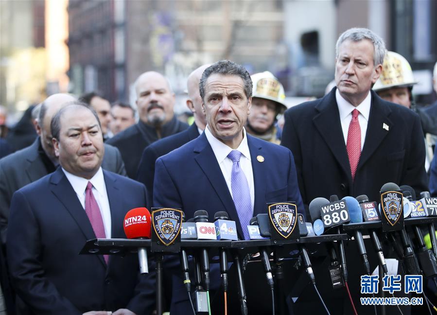 12月11日,在美国纽约,纽约州州长科莫(中)在爆炸现场附近举行的发布会上讲话。