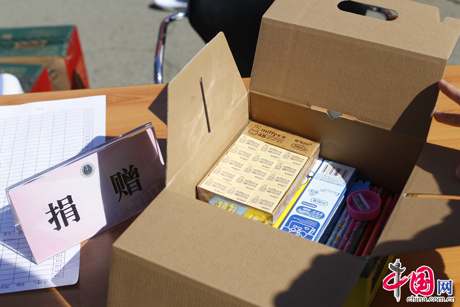 图为军事医学研究院志愿者对疆扶贫活动中的捐赠文具。(图片由军事医学研究院提供)
