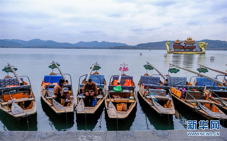西湖边等待游客的手划船(12月13日摄)。进入冬季,随着气温不断降低,杭州西湖呈现出冬日特有的“多彩画卷”。金黄的梧桐、绿色的垂柳、红色的枫叶、凋零的残荷以及越冬的候鸟,让冬日西湖美丽多彩又不乏生机。新华社记者徐昱 摄