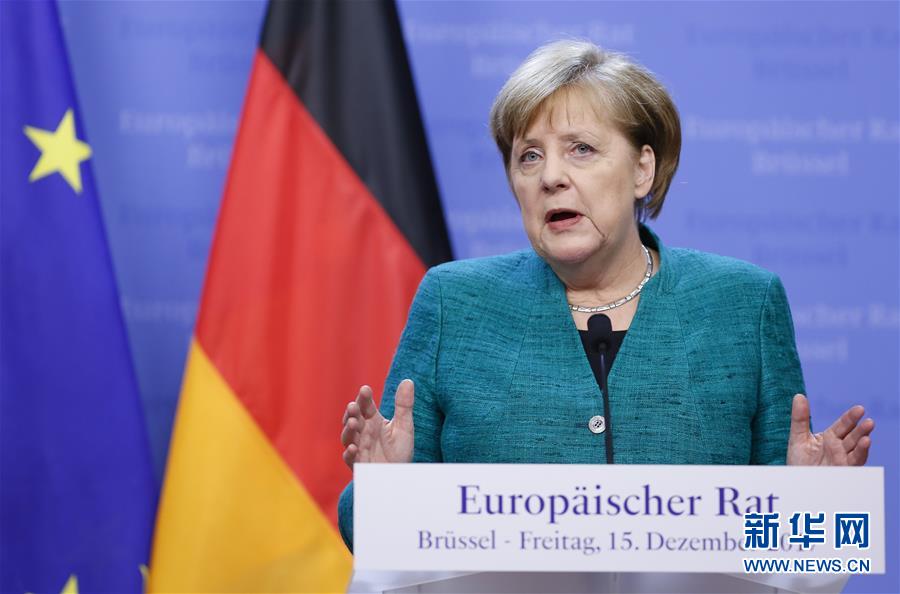 12月15日,在比利时首都布鲁塞尔,德国总理默克尔出席新闻发布会。欧盟除英国以外的27国领导人15日在布鲁塞尔欧洲理事会总部举行会议,宣布英国“脱欧”第一阶段谈判已在“分手费”、爱尔兰边界以及欧盟在英公民权利等核心议题上取得“足够进展”,可以开启第二阶段谈判。新华社记者叶平凡 摄
