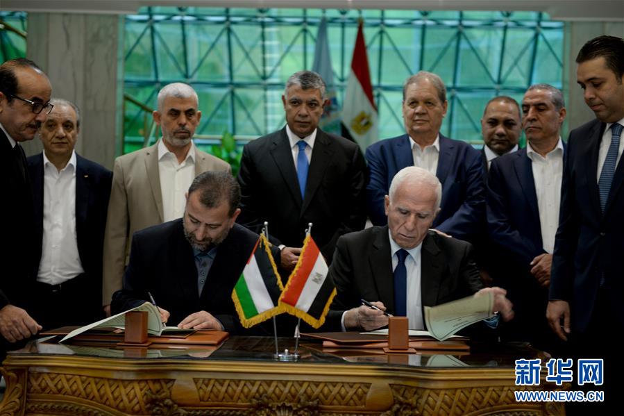 2017年10月12日,在埃及开罗,巴勒斯坦民族解放运动(法塔赫)负责和解事务的官员阿扎姆·艾哈迈德(前右)与巴勒斯坦伊斯兰抵抗运动(哈马斯)谈判代表团负责人萨利赫·阿鲁里(前左)签署协议,同意和解,结束长期分裂的局面。新华社发