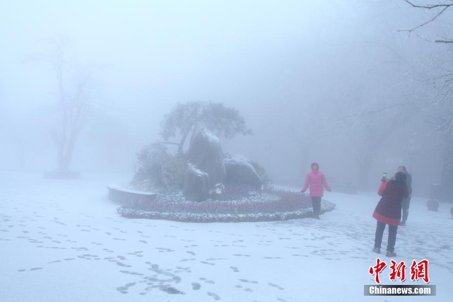 受强冷空气影响,12月16日清晨,江西庐山风景区降下2017年入冬第一场雪,此次降温幅度大,景区还出现雾凇雨凇景观。降雪虽然不厚,但是给树木和山峦披上了一层银装,引得游客纷纷驻足观赏。吴健 摄