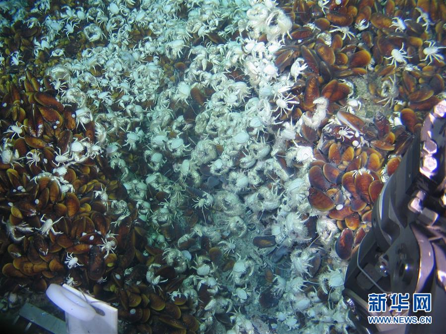 这是通过“蛟龙”号载人潜水器获得的海底毛瓷蟹(白色)和贻贝(褐色)图像(2013年6月17日摄)。