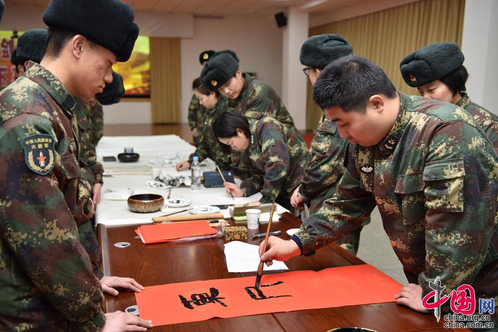 火箭军砺剑文化轻骑队为基层官兵写春联。(图片由火箭军政治工作部提供)