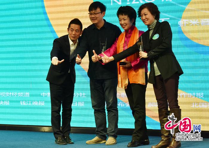 阿里巴巴集团合伙人、社会公益部总经理孙利军(左)为新华社资深记者罗争光,中央电视台主持人元元,中央电视台主持人黄薇颁发“2017最具温度媒体人奖”。图为颁奖后四人合影。