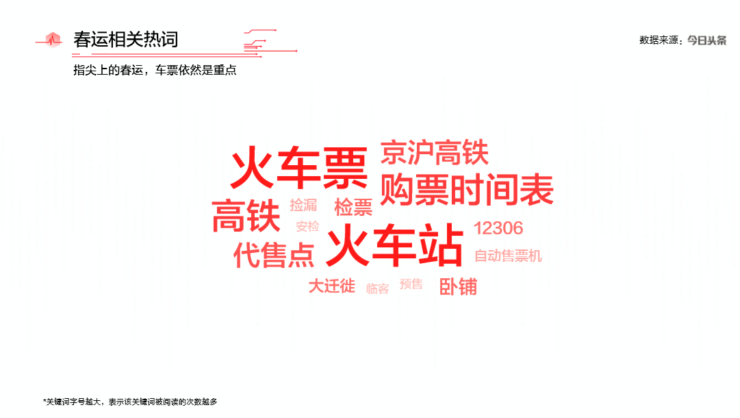 在今日头条有关春运的相关内容中,火车票、火车站、购票时间表、高铁是被浏览最多的内容关键词,而京沪高铁、京广高铁和沪昆高铁则是最受关注的三条春运线路。据中铁总的统计显示,到2017年底,全国铁路营业里程达到12.7万公里,其中高铁2.5万公里,占世界高铁总量的66.3%。