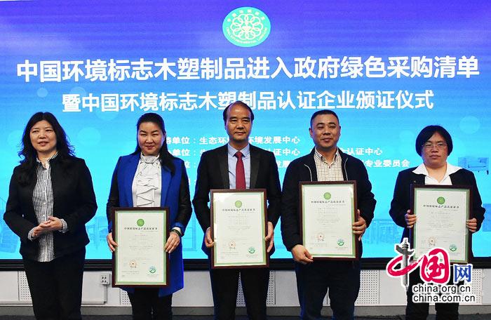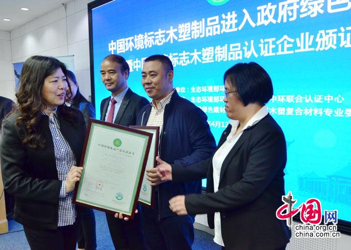 中环联合认证中心总经理张小丹为获得中国环境标志木塑制品认证的四家企业代表颁发认证证书并合影。