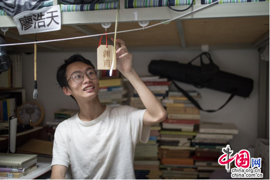 廖浩天是国学院2016级本科生。作为国学院的同学,墙边堆满的书籍几乎是每个人寝室的“标配”,他也不例外。“我的‘书墙’摆放会有一个顺序,一部分是古书,而另一部分是‘看着玩’的书籍,有时候我想写一些东西但词藻不够充润的时候,可能就会半夜起床把这些书拿出来读一遍再去进行写作。”“渊甫”是廖浩天的字。在去年汉服社的成人礼上,他向老师求得了“渊甫”为字,以《中庸》中“肫肫其仁,渊渊其渊,浩浩其天”一句为其出处,老师希望他在广博的学习中更能够沉潜刚克专下去。 王浩丞 摄影