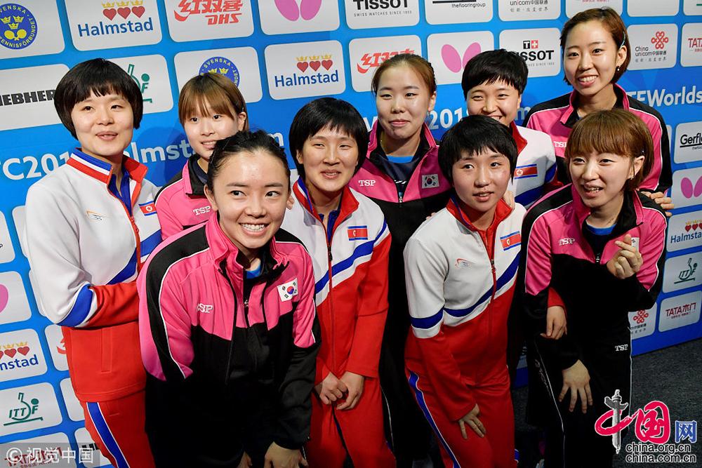 韩国乒乓球协会5月3日消息称,韩朝双方决定在当天进行的2018年乒乓球世界团体锦标赛女子四强争夺赛中放弃比拼,将组建联队参加接下来的比赛。图为当地时间5月3日,参加2018乒乓球团体世锦赛的韩国和朝鲜运动员合影。图片来源:CFP