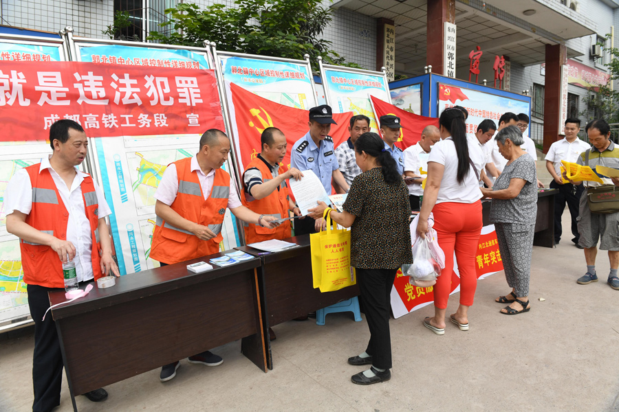 为进一步提高铁路沿线村民爱路护路意识,扎实推进“七进”教育活动,5月14日上午,中国铁路成都局集团有限公司成都高铁工务段内江北桥路车间联合内江北站铁路派出所、内江北车站、成都供电段内江北供电车间、重庆电务段内江北通信信号车间以及郭北镇政府等6个单位30余名职工,在内江市郭北镇开展了一场高铁安全知识“进农村、进乡镇、进街道”路外安全宣传活动。
