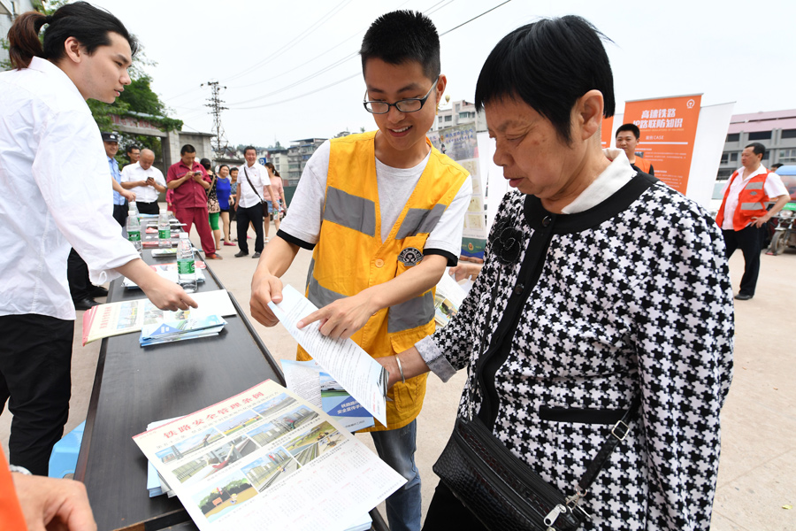 活动现场,宣传队员们就铁路人身伤害事故案例、高铁周边乱搭乱建、种植危树、堆放易燃易爆物品以及破坏铁路设施等违反铁路安全规定的行为与村民们进行了讲解。热情洋溢的解说,生动有趣的宣传画报,吸引了众多村民观看听讲。村民李大爷表示:“铁路就像我们的亲人,要爱护,要保护,你们这个宣传活动搞得好,争取每个月来我们这里一次。还有,我还没有坐过高铁,啥时候修到我们家门口嘛。”真情流露的话语,让现场众人都笑出了声,青年志愿者们也忙感谢和解答大爷疑惑:“谢谢大爷理解我们的工作,现在高铁已经建到内江了,有机会一定要去坐哦。”