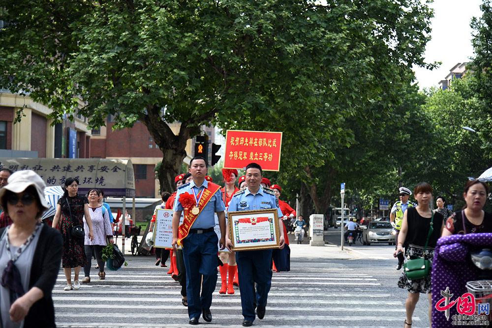 武汉青山——为身上披绶带、胸前带红花的邱先祥在部队工作组的陪同下返回家乡,联合当地政府、人武部和民政局再次进行表彰奖励,将喜报证书送到家中。陈立春 摄