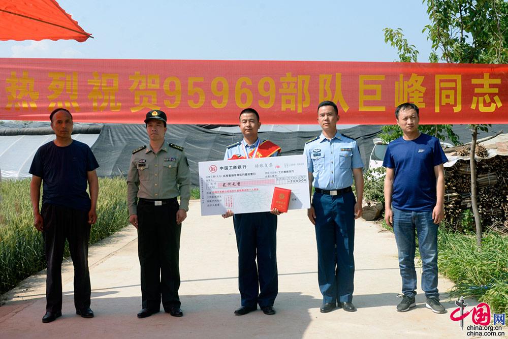 陕西扶风——空降兵某旅连长巨峰手拿立功喜报和当地人武部、民政局工作人员合影。 (何勇 摄影)