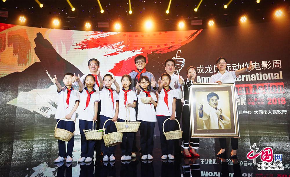 来自大同六个贫困县的少年儿童代表将独具地方特色的“大同小杂粮”送给成龙。