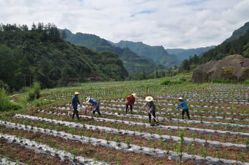 6月21日,重庆市革命老区石柱土家族自治县中益乡华溪村辣椒生产基地,部分农事“钟点工”在给辣椒锄草、施肥。