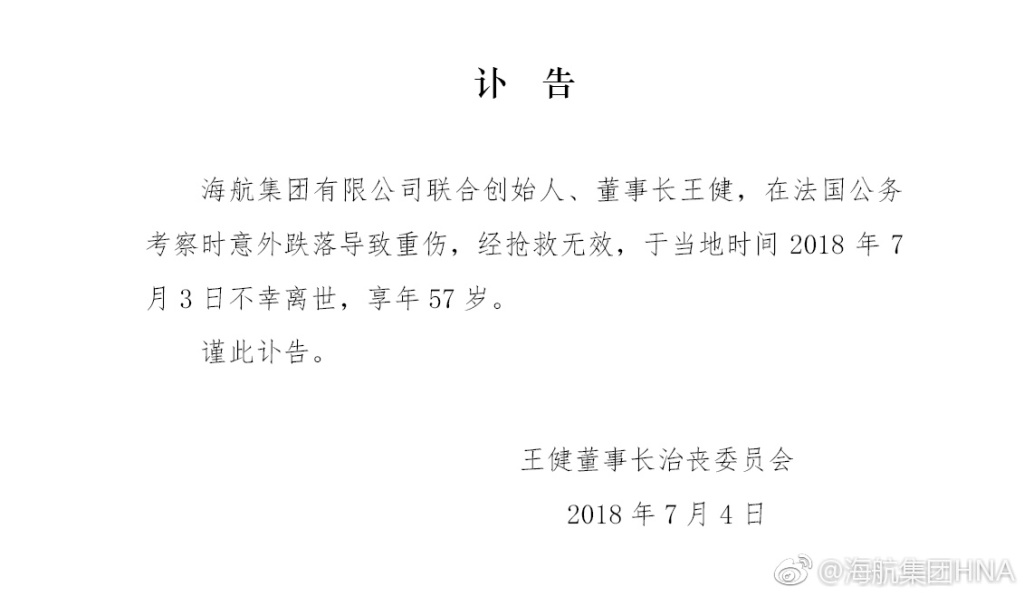 中国网讯 海航集团官方微信称,海航集团有限公司联合创始人、董事长王健,在法国公务考察时意外跌落导致重伤,经抢救无效,于当地时间2018年7月3日不幸离世,享年57岁。