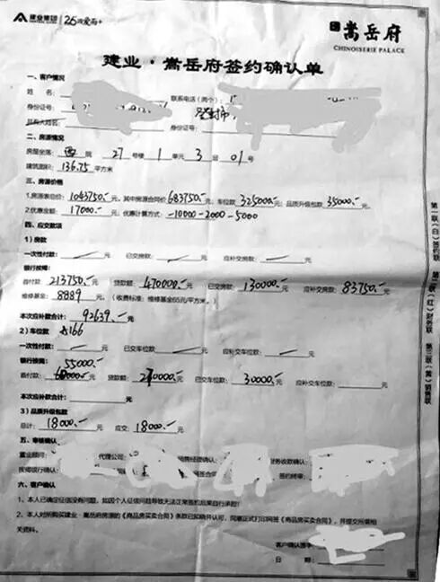 为进一步了解情况,记者以购房者身份看中了1套房,价格谈好后,售楼部工作人员拿出了一份建业·嵩岳府签约确认单,一套建筑面积136.75平方米总房款是1043750元,其中房源合同价为683750元,车位款为325000元,品质升级包款为35000元。工作人员说:“一个房子,一个车位,一个高品质升级包,加起来还是你的总房款,总共是7632元1平米。交钱可以分期,车位分期首期最低是3万,车位开正规发票,还是开房地产公司的发票。到房管局草签备案价是683750元”。