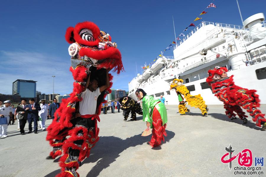 当地时间7月11日,在巴布亚新几内亚莫尔斯比港码头,当地民众舞动中国狮热情欢迎中国海军和平方舟医院船再次到访。江山摄