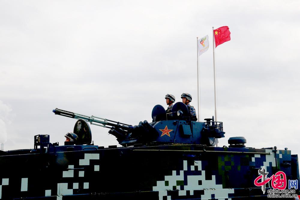 中国海军陆战队在“国际军事比赛-2018”“海上登陆”陆战队分队比赛誓师动员大会现场。摄影 尚文斌