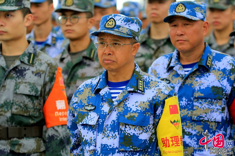 中国海军陆战队在“国际军事比赛-2018”“海上登陆”陆战队分队比赛誓师动员大会现场,图为赛事工作人员。摄影 尚文斌