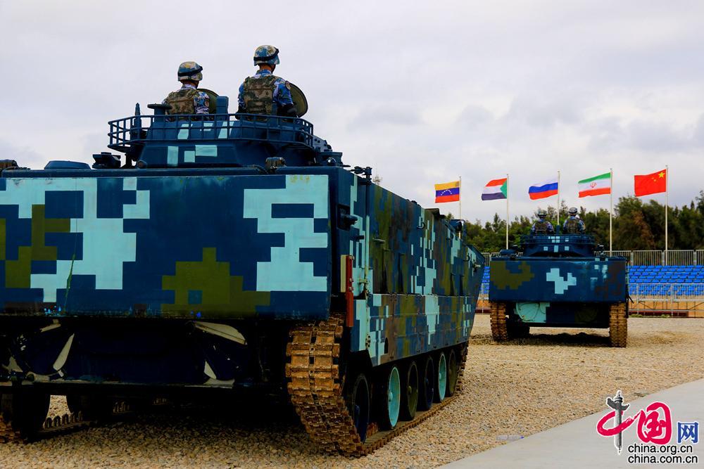 中国海军陆战队在“国际军事比赛-2018”“海上登陆”陆战队分队比赛誓师动员大会现场,参赛队员严阵以待。摄影 尚文斌