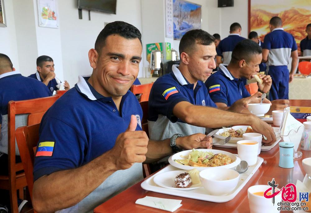 “国际军事比赛-2018”“海上登陆”陆战队分队比赛外军参赛队陆续抵达中国赛区。图为委内瑞拉陆战队员就餐。 摄影 尚文斌