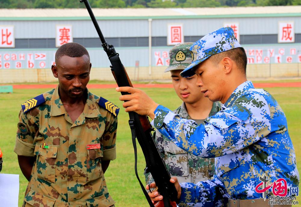 中国海军陆战队员指导苏丹海军陆战队员操作使用武器。 摄影 尚文斌