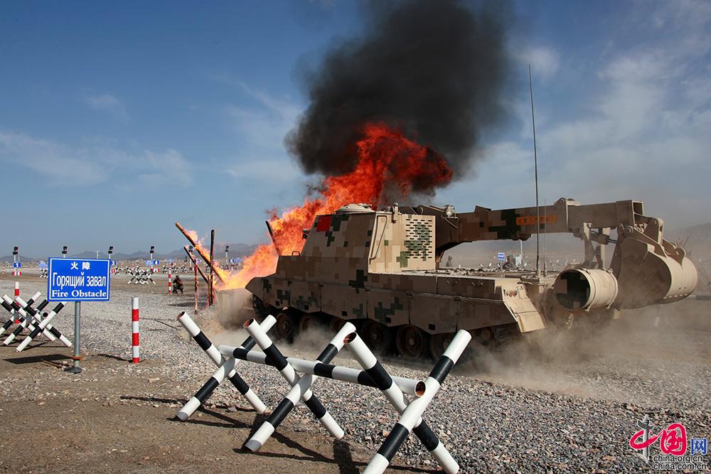 中方参赛队员驾驶多用途工程车撞开火障。袁凯 摄