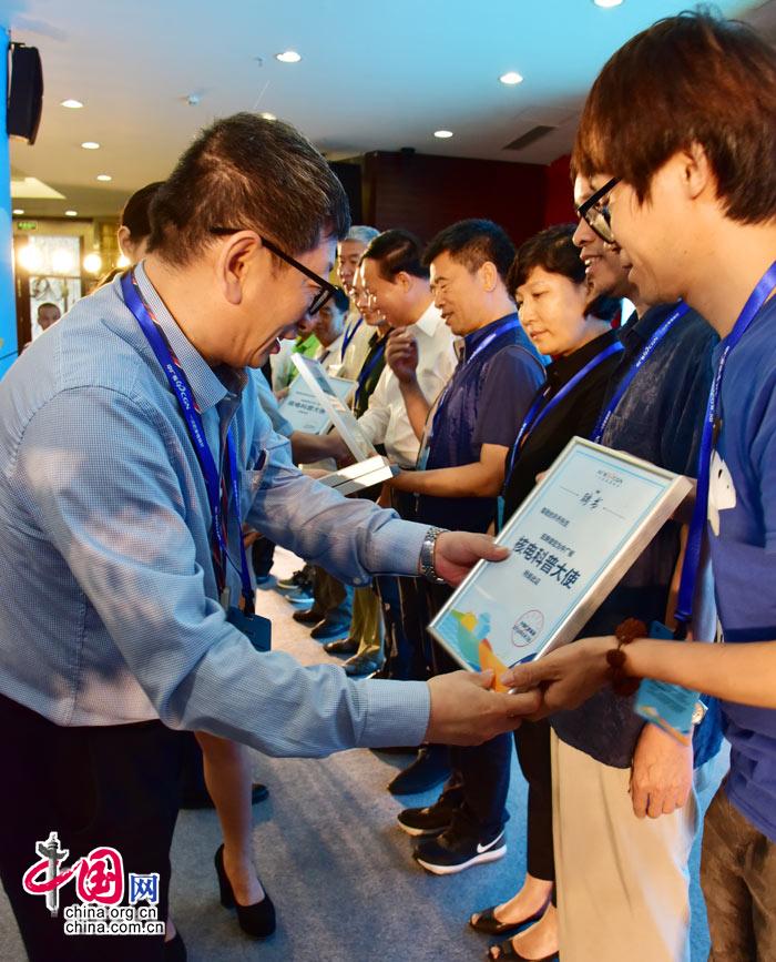 与会的中广核领导给九位“绿色中国年度人物”颁发“核电科普大使”证书。(韩琳 摄)