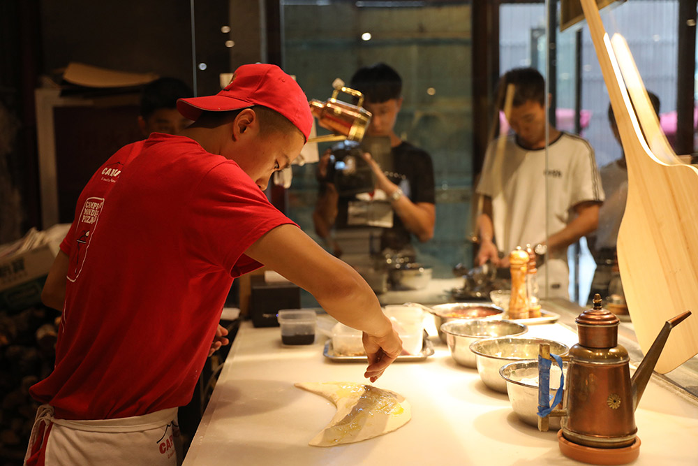图为第十七届意大利拿坡里披萨大赛季军厨师团队为我们展示制作披萨的全过程。
