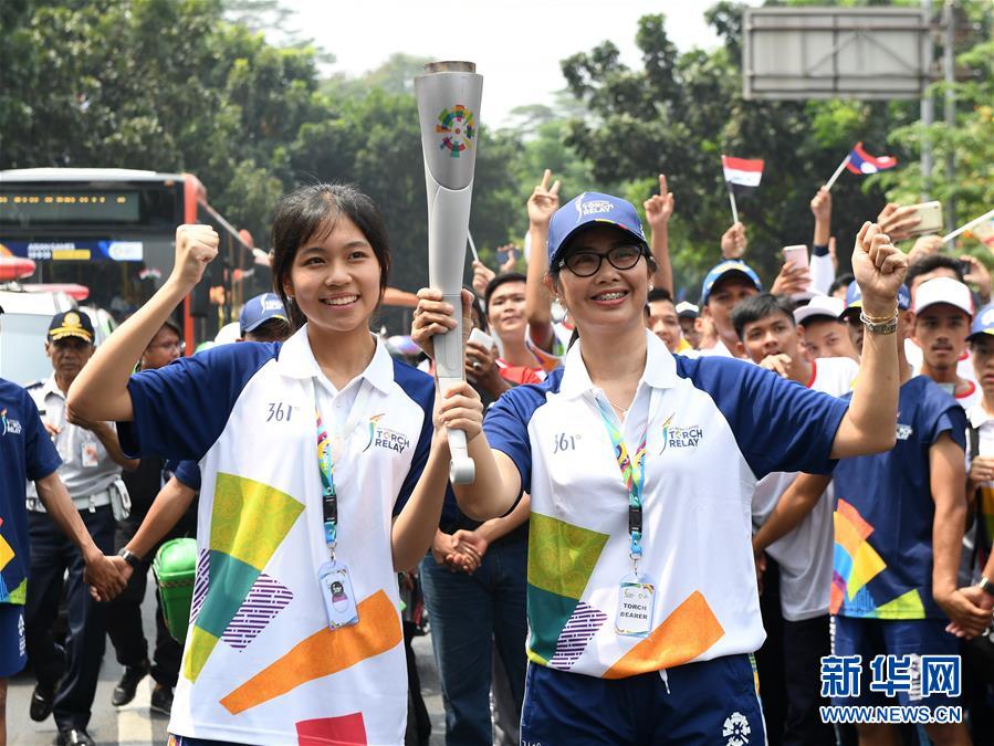 8月15日,来自中国的火炬手张鸿宜(前左)将火炬交给下一名火炬手。 当日,第18届亚运会火炬在印度尼西亚雅加达传递。第18届亚运会将于18日在雅加达开幕。 新华社记者 李贺摄