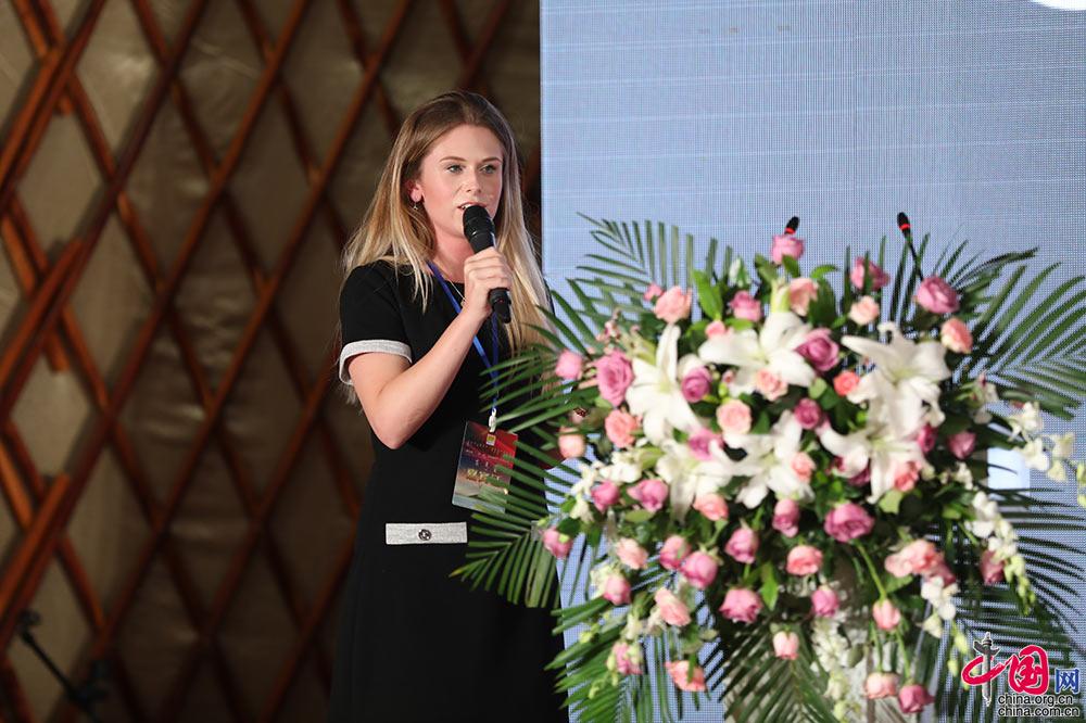 8月17日,“一带一路·敖包相会“2018青年共创共享幸福论坛召开,来自世界以及祖国各地的40对情侣和参会嘉宾共话幸福。图为在中国生活的英国人葛燕希发表演讲。中国网 董宁 摄影