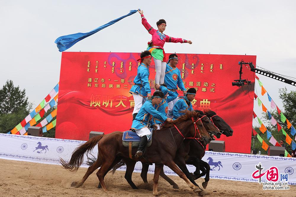 8月18日,在通辽市“一带一路·敖包相会”主题活动之科左后旗第二届骑手会暨森林会开幕式上,内蒙古马术队为现场观众表演了精彩的马术。中国网记者 董宁摄影
