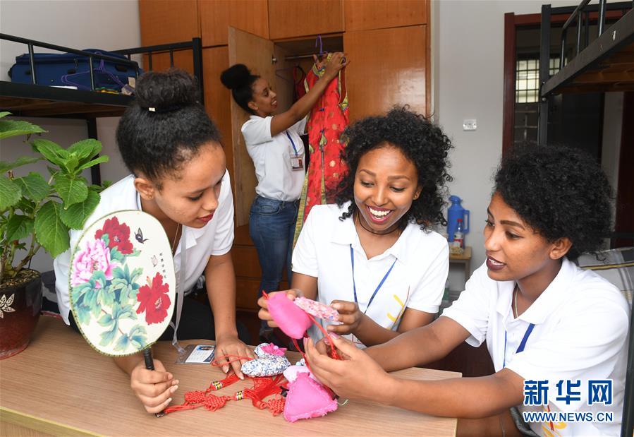 8月30日,安泰时装有限公司的埃塞俄比亚员工在宿舍交流她们收集的中国工艺品。 新华社记者翁忻旸摄