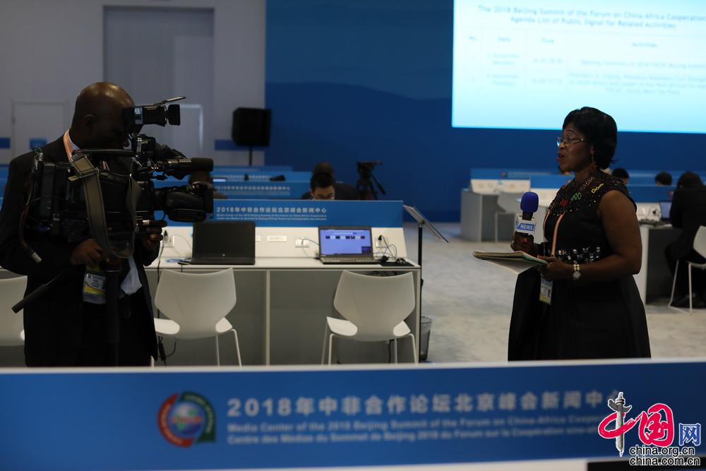喀麦隆广播电视台的记者在峰会新闻中心内进行峰会相关新闻的播报。中国网记者 郑亮摄影