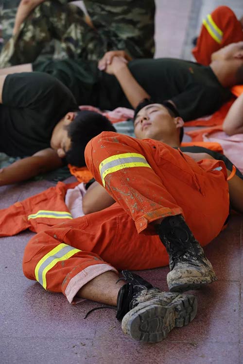 救灾官兵精疲力竭,席地而睡。