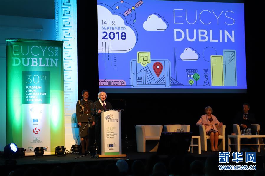 9月15日,在爱尔兰首都都柏林,爱尔兰总统希金斯(左二)在第30届欧盟青少年科学家竞赛开幕式上致辞。 第30届欧盟青少年科学家竞赛15日在爱尔兰首都都柏林开幕,来自中国的3名选手参加。欧盟青少年科学家竞赛由欧盟委员会于1989年发起创立,旨在发现青少年科学人才、促进青少年科学家的交流与合作。 新华社发